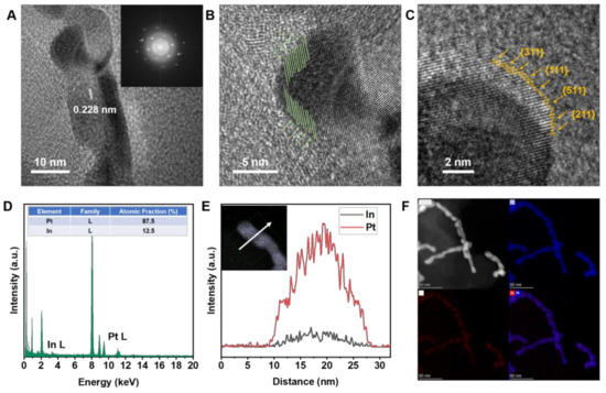 Figure 2A shows high-resolution TEM images of Pt89In11 NWs. The corresponding fast Fourier transform (FFT) pattern also confirms the quasi-single crystalline nature of Pt89In11 NWs. The spacing lattice fringe is measured to be 0.228 nm, corresponding to (111) facet of FCC Pt. Interestingly, when magnified to atomic resolution, an uneven surface can be clearly observed (Figure 2B,C). Some surface steps and concave sites can be identified by the arrow. In addition, plenty of high-index facets, such as {311}, {211} or even {511}, are clearly identified on the uneven surface of the hierarchical Pt89In11 NWs, which is beneficial to improving the intrinsic electrocatalytic activity [23,24]. The ratio of Pt/In is determined to be 87.5/12.5, as characterized by TEM-EDS analysis (Figure 2D), which is in accordance with the ICP-OES results. Moreover, the EDS line scan and elemental mapping results reveals that the Pt and In elements distribute uniformly in the whole NW.