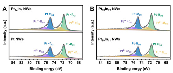 X-ray photoelectron spectroscopy (XPS) was carried out to analyze the valence state of Pt in Pt and Pt-In NWs (Figure S2). All the binding energies were calibrated with C 1 s at 284.8 eV as a reference. Figure 3A,B show the high-resolution Pt 4f XPS spectra. The binding energies at around 71.5 eV and 74.5 eV can be assigned to 4f7/2 and 4f5/2 orbitals of metallic Pt [25,26]. Meanwhile, the peaks at around 72.4 eV and 75.8 eV are associated with Pt (II). The Pt (0) to Pt (II) ratio is calculated to be ~2/1 for these four samples, indicating that Pt is mainly in a metallic state. In addition, the Pt 4f7/2 binding energies of Pt and Pt-In NWs are very close (~71.5 eV), which suggests a similar electronic structure.