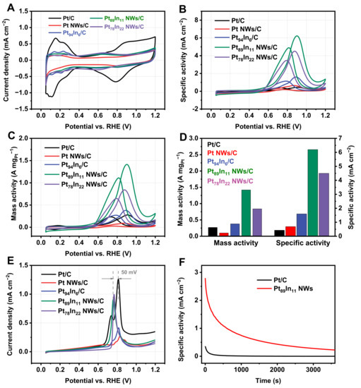 The obtained Pt-In NWs were then employed as MOR electrocatalysts, and commercial Pt/C (60 wt.%) was used as a reference. Figure 4A shows the CV curves of the studied electrocatalysts in N2-saturated 0.1 M HClO4. Three distinct regions can be observed, including underpotential adsorption and desorption of hydrogen (Hupd) at the potential range of 0–0.4 V, double-layer region, and surface adsorption/reduction of hydroxyl species on Pt surface (above 0.7 V). An interesting phenomenon is that after introducing the In element, the surface adsorption of the hydroxyl species appears at a relatively low potential (~0.65 V), which can be attributed to the strong oxyphilicity of the In element. Therefore, we hypothesize that the presence of hydroxyl species will benefit the oxidation of CO species and improve the MOR activity. Further evidence, such as in situ Raman spectroscopy, will be carried out to verify this hypothesis. The electrochemical surface areas (ECSA) of the studied electrocatalysts are 62.3, 14.0, 23.8, 22.7 and 18.7 m2 gPt−1 for Pt/C, Pt NWs, Pt94In6 NWs, Pt89In11 NWs, and Pt78In22 NWs, respectively, calculated according to Hupd.