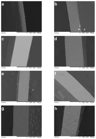The SEM cross-sections of the cryo-fractured films are presented in Figure 2. All films presented a dense, continuous and smooth surface without roughness, which could be related to the CS film-forming capability and miscibility between components [13,21,38]. It can be observed that the F0/0 sample, as pure chitosan control film (Figure 2a), was thinner than both the F5/0 films (Figure 2b) and the others (Figure 2c–h). This was expected since the addition of plasticizers to biopolymers increases the free volume and intermolecular spaces of their matrices [13]. The presence of the PECs with size < 370 µm [39] could have also contributed to this effect and were visualized as rounded shades in the cross-sections of the films F5/5 (Figure 2g) and F5/10 (Figure 2h).