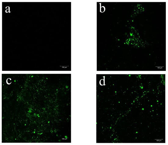 Moreover, other magnifications at 20× and 40× were selected to better observe the particle morphology in the CS-composite films at higher levels of açaí PEC incorporation, as shown in Figure S1 (Supplementary Material). It was noted (Figure S1a–d) that the PECs exhibited spherical-like structures, similar to vacuoles containing the açaí oil (stained in green), which is a typical behavior of coacervates [43]. Similar observations were reported by Silva et al. [42] when studying the morphology of stained chitosan/virgin coconut oil-based emulsion films by CSLM. These authors found that, at lower oil concentration, the CS films exhibited a more homogenous distribution of the lipid droplets. Furthermore, they observed that, as the coconut oil concentration increased, the occurrence of aggregates or larger oily particles also increased, possibly because of changes in interfacial tension of the emulsion droplets during film drying.