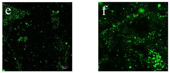 It was possible to observe the Fluorescent Green dyed açaí PECs incorporated into the CS-composite films, which appeared in black (Figure 3). The dyed açaí oil within the microparticles was detected well by fluorescence [42]. Figure 3a shows the control CS-DES film (F5/0) at 10× magnification, which did not display any fluorescence and was used as a negative control with the other stained films. The frequency of fluorescent regions clearly increases with increasing proportion of PECs incorporated into the films, F5/0 (Figure 3a) < F5/10 (Figure 3f). A more meticulous observation at different focal planes revealed some PEC aggregation and a heterogenous distribution in the films with increasing amounts of the particles F5/0.25 (Figure 3b) > F5/10 (Figure 3f). This behavior could be the result of water evaporation during film drying, leading the particles to aggregate. Furthermore, it was possible to observe particles standing upon each other in different layers of the film. This behavior was also noted by Silva et al. [42] in chitosan/virgin coconut oil-based films.