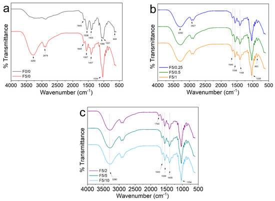 FTIR spectra for (a) pure CS (F0/0) and CS-DES (F5/0), (b) F5/0.25, F5/0.5 and F5/1, and (c) F5/2, F5/5 and F5/10.