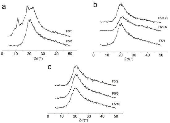 The main characteristic observed in these diffractograms is the decrease in crystallinity in the plasticized CS films when compared to the unplasticized F0/0 ones. The peak at 2θ = 11.5° was significantly weakened with the addition of DES, as can be visualized in the diffractogram for the plasticized CS films (Figure 5). This result can be justified by the loss of hydrogen bonds between amino and hydroxyl groups in CS due to complexation with the plasticizer, which results in the increase in the amorphous structure of CS-DES films. Wong et al. [53] also observed that the addition of DES to chitosan–carboxymethylcellulose films significantly reduced the intensity of the reflection at 2θ = 2.9°. The F5/0 film exhibited only one broad peak around 2θ values of 20.4° (Figure 5a). This behavior was also observed in the other films, each of which displayed only one broad peak at 2θ = ~20°, as can be visualized in Figure 5b,c.