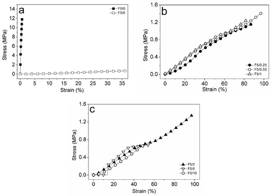 Stress versus strain curves for films: (a) F0/0 (full squares) and F5/0 (open squares); (b) F5/0.25 (full circles), F5/0.5 (circles), F5/1 (triangles); (c) F5/2 (full triangles), F5/5 (inverted triangles) and F5/10 (lozenges).