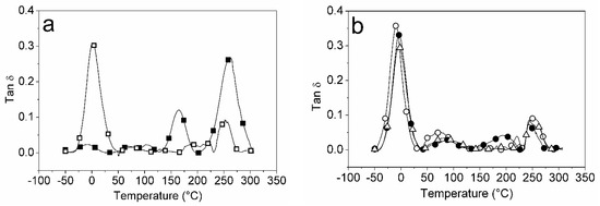 Compression molded samples with dimensions of 14.0 mm × 8.0 mm × 0.3 were analyzed in a Q800 DMA (TA Instruments, New Castle, DE, USA) using a film clamp at 1 Hz under multi frequency-strain mode from −50 to 310 °C and at a heating rate of 3 °C min−1 [72]. A total of two measurements were taken for each sample. The results were presented as loss factor (tan δ) and given by the ratio between the loss modulus (E″) and the storage modulus (E′) as a function of temperature.