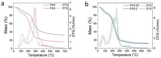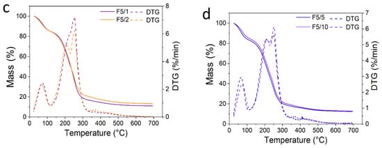 TGA (continuous lines) and DTG (dashed lines) curves for (a) CS-based films, F0/0–F5/0; (b) F5/0.25–F5/0.5; (c) F5/1–F5/2; and (d) F5/5–F5/10.