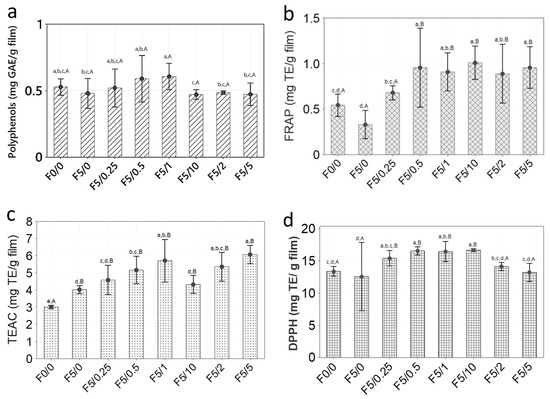 Antioxidant properties of CS-based films determined by TPC (a), FRAP (b), TEAC (c) and DPPH (d) assays. Different lowercase (a, b, c, d) or uppercase (A, B) letters within a column indicate significant differences between samples by Tukey’s test or Dunnett’s test, respectively (p < 0.05).