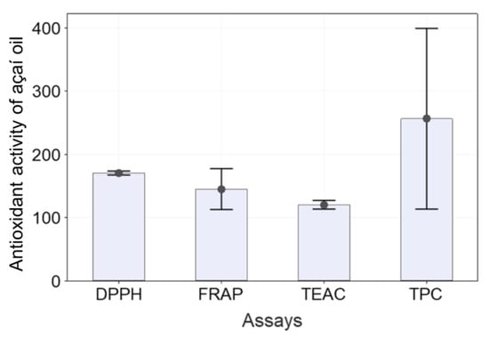 Antioxidant activity of açaí oil by DPPH radical scavenging, FRAP, TEAC and TPC assays. The results shown are mean (column) ± standard deviation (bar) (n = 3) values for DPPH, FRAP and TEAC assays, expressed as mg TE L−1 of oil, and for TPC as mg GAE L−1 of oil.