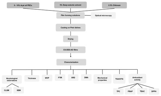Flowchart of the experimental process to obtain and characterize the chitosan/deep eutectic solvent films containing açaí–filled microcapsules.