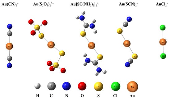 In addition to the alternative lixiviants mentioned above, new highly efficient and environmentally friendly reagents have been discovered or designed, such as ionic liquid, dicyanamide, ferrocyanide, etc. [,,]. However, those new gold leaching reagents are in the preliminary research phase. The bonding properties of Au(CN)2−, Au(S2O3)23−, Au[SC(NH2)2]2+, Au(SCN)2−, and AuCl2− in the quantum chemistry perspective would support instructive information for the discovery and design of new highly efficient and environmentally friendly gold leaching reagents. Although there are many studies on gold leaching by thiosulfate (S2O32−), thiourea (SC(NH2)2), thiocyanate (SCN−), and halogen, there is a lack of systematic wavefunction analysis of the gold complexes Au(CN)2−, Au(S2O3)23−, Au[SC(NH2)2]2+, Au(SCN)2−, and AuCl2−.