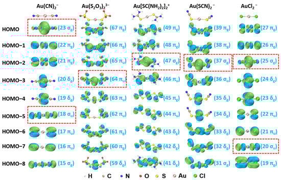 The isocontour surfaces of molecular orbitals (MOs) from HOMO to HOMO-8 for Au(CN)2−, Au(S2O3)23−, Au[SC(NH2)2]2+, Au(SCN)2−, and AuCl2− derived from TPSSh/aug-cc-pVTZ calculation are presented in Figure 2. Based on CDA, the main MOs contributing to σ-donations are highlighted by the red-dash rectangular frames shown in Figure 2.
