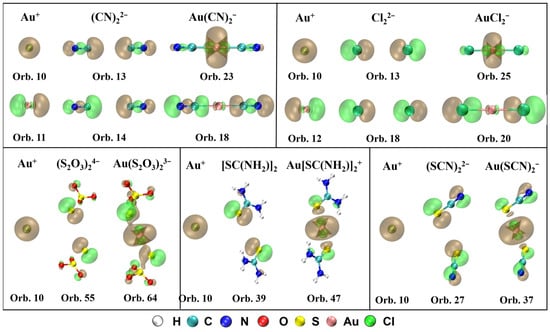 MOs that contribute to σ-donation and their orbital composition from Au+ and ligands for Au(CN)2−, Au(S2O3)23−, Au[SC(NH2)2]2+, Au(SCN)2−, and AuCl2− (isosurface = 0.04 a.u.).
