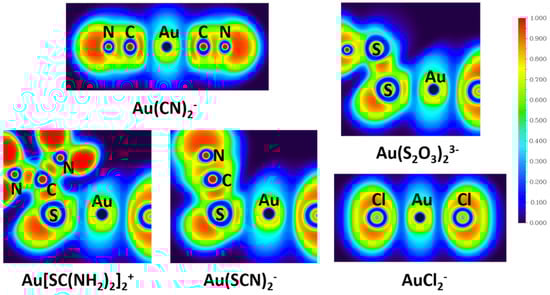 The electron localization functions (ELFs) of Au(CN)2−, Au(S2O3)23−, Au[SC(NH2)2]2+, Au(SCN)2−, and AuCl2− derived from TPSSh/aug-cc-pVTZ calculation.