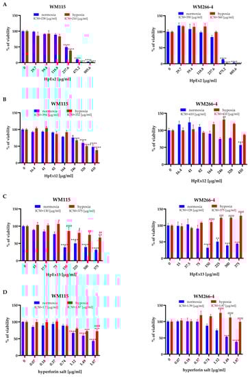 The results obtained showed significant differences in the cytotoxic effect of HpExs between primary and metastatic melanoma cells, and also between normoxia and hypoxia within analyzed cell lines. The viability of primary WM115 cells treated with HpExs and hyperforin salt showed a dose-dependent decrease under both oxygen conditions (except HpEx13 in hypoxia, as only the highest concentration reduced cell viability). In contrast, the reduction of the WM266-4 metastatic cell viability was observed only in normoxia, except for HpEx2 in the highest concentrations (475.2 μg/mL and 885.6 μg/mL), with a strong cytotoxic effect also in hypoxia. What is especially interesting is that the highest doses of HpEx12, hyperforin salt, and, in particular, HpEx13, activated the viability and/or metabolic activity of WM266-4 metastatic cells in hypoxia (Figure 1).