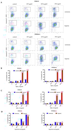 Detection of apoptosis in the WM115 and WM266-4 melanoma cells treated with ethanolic extracts of Hypericum perforatum and hyperforin salt, cultured under normoxia (blue bars) and hypoxia (red bars), determined by FITC-conjugated Annexin V staining in flow cytometry. Representative dot plots for WM115 and WM266-4 cells treated with commercially available extract 2 (HpEx2) (A), and bar charts for melanoma cells treated with HpEx2 (B), HpEx12 (C), and hyperforin salt (D). The results are expressed as mean values ± SD. Statistical significance for the data was evaluated by a two-way ANOVA, followed by a Tukey’s honestly significant difference, multiple range test. Significance levels between treated cells relative to untreated cells are indicated with asterisks as follows: * p ≤ 0.05; ** p ≤ 0.01; *** p ≤ 0.001; **** p ≤ 0.0001. The comparison for treated cells within a given dose between normoxia and hypoxia is indicated with hash marks as follows: # p ≤ 0.05; ## p ≤ 0.01; #### p ≤ 0.0001.