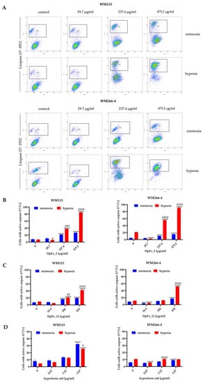 Detection of activated caspases 3 and 7 in apoptotic cells of the WM115 and WM266-4 melanoma lines treated with ethanolic extracts of Hypericum perforatum and hyperforin salt, cultured under normoxia and hypoxia, determined by flow cytometry. Representative dot plots for WM115 and WM266-4 cells treated with commercially available extract (HpEx2) (A), and bar charts for melanoma cells treated with HpEx2 (B), HpEx12 (C), and hyperforin salt (D). The results are expressed as mean values ± SD. Statistical significance for the data was evaluated by a two-way ANOVA, followed by a Tukey’s honestly significant difference, multiple range test. Significance levels between treated cells relative to untreated cells are indicated with asterisks as follows: ** p ≤ 0.01; *** p ≤ 0.001; **** p ≤ 0.0001. The comparison for treated cells within a given dose between normoxia and hypoxia is indicated with hash marks as follows: # p ≤ 0.05; ## p ≤ 0.01; ### p ≤ 0.001; #### p ≤ 0.0001.