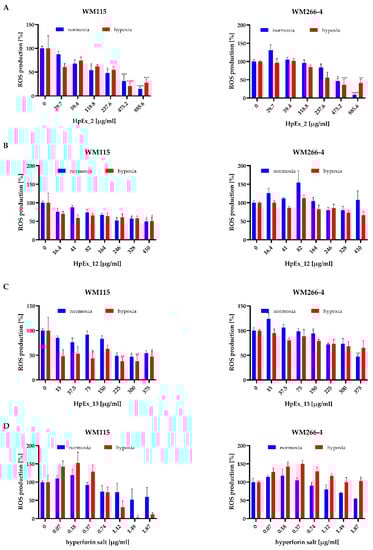 Due to the importance of oxidative stress in melanoma progression, in the next stage of our research, the impact of HpExs and hyperforin salt on ROS generation was assessed. (Figure 4).