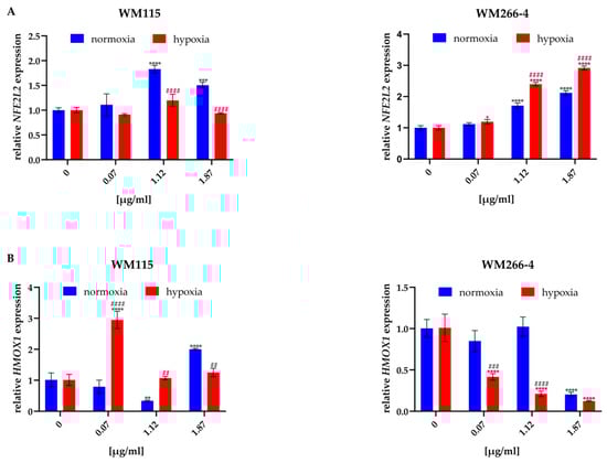Differences between normoxia and hypoxia were also observed within a given dose of hyperforin salt (1.12 μg/mL and 1.87 μg/mL). In WM115 cells, the increase in NFE2L2 expression was lower under hypoxic than normoxic conditions, in contrast to WM266-4 cells, in which hypoxia promoted its expression (Figure 5A). The expression of HMOX1 was lower in hypoxia than in normoxia in WM266-4 cells treated with hyperforin salt at all concentrations and in WM115 cells at the highest concentration of this SM. In the presence of 0.07 μg/mL and 1.12 μg/mL of hyperforin salt, the HMOX1 level was significantly up-regulated in WM115 cells cultured under hypoxia (Figure 5B).