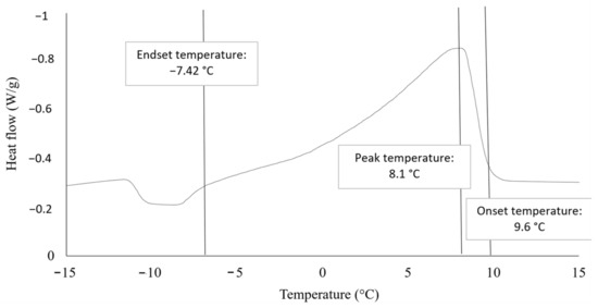 From Figure 1, the value obtained from the graph for onset temperature is 9.6 °C, the peak temperature is 8.1 °C and the end set temperature of biodiesel obtained is −7.42 °C. The temperature range for the following section of the experiment was determined using the SAC approach employing the crystallization point of biodiesel from the analysis. It is in line with the finding from a previous study conducted by Samsuri et al. [12], where the starting point of crude biodiesel crystallization was 9.45 °C, which was maximal at 8.4 °C, thus showing the highest rate of reaction. Towards the end, the temperature dropped to −5.18 °C, indicating the end of the experiment.
