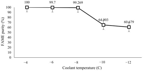 The trend line in Figure 3 shows a slight decrease in trend, from −4 °C to −8 °C, until it drops downs steeply, at −10 °C, until −12 °C. The highest percentage of 100% purity is at the highest temperature, which is at −4 °C; meanwhile, at −10 °C, the FAME yield purity obtained is the lowest, which is at 60.68%. The crystallization temperature indicated by the onset temperature of this experiment is found to be at 9.6 °C and expected to end (as estimated) by the end set temperature of −7.42 °C. Hence, biodiesel is predicted to crystallize during conducting this experiment as all the parameters are lower than the crystallization temperature. As the coolant temperatures of −10 °C and −12 °C are much lower than the end set temperature, it is expected that this operating condition would yield a low purity of FAME. In comparison to biodiesel produced from solvent 1-butanol, the study mentioned that the highest biodiesel purity was achieved, 99.375%, when the coolant temperature was set at 12.7 °C [12]. This is because their onset and endset temperatures obtained from their DSC analysis were 9.45 °C and −5.18 °C, respectively, with a peak temperature of 8.4 °C. Nevertheless, this study was able to achieve even higher biodiesel purity which is 100% at a coolant temperature of −4 °C [12]. Hence, it is concluded that the use of 2-MeTHF as a solvent for SAC is able to produce higher biodiesel purity than 1-butanol despite the coolant temperature used.