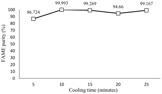 For this part of the experiment, the coolant temperature and stirring rate were kept constant, at −8 °C and 140 rpm, respectively. The parameter range for cooling time is 5 min, 10 min, 15 min, 20 min, and 25 min. Figure 4 shows the plotted graph using GC-MS data for FAME purity against cooling time, while Table 2 showed the observation of the effect of cooling time in SAC. For the cooling time parameter, at constant −8 °C and 140 rpm, a cooling time of 10 min indicates the optimum value to yield the highest purity of FAME content, which is 99.993% purity.