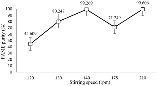 Figure 5 shows an increase in the trend line from 120 rpm to 140 rpm from a value of 44.61% to 99.27%. At 175 rpm, the value of FAME purity decreases to 71.25%, and it increases to its highest purity at 210 rpm at 99.61%. In order to improve the formation of a solid, an aid for the solution movement is essential [18]. The parameter of this experiment is affected by the rate of stirring speed that is set by the laboratory mixer. As stated by Mohammed and Bandari [21], in maintaining a continuous temperature distribution and system flow, a gradual motion is essential. Therefore, a steady increase in stirring speed is chosen (120 rpm, 130 rpm and 140 rpm). After that, there is a disparity in stirring speed as the increment between the value is high (140 rpm, 175 rpm and 210 rpm). Consequently, this describes the irregularity of the trend line after 140 rpm. In comparison to biodiesel produced from solvent 1-butanol, the study mentioned that the highest biodiesel purity was achieved, 99.375%, when the stirring speed was set at 175 rpm [12]. Under similar stirring speeds, it is found that this study produced lower biodiesel purity (71.25%) compared to the one with 1-butanol. The highest biodiesel purity found in this study is 99.61% at a stirring speed of 210 rpm, which was a higher stirring speed used compared to the study with 1-butanol. Nevertheless, it is concluded that the use of 2-MeTHF as a solvent for SAC is able to produce higher biodiesel purity than 1-butanol despite the stirring speed used.