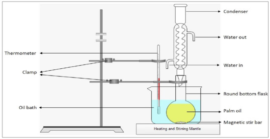 The experimental setup for the transesterification process is referred to the study conducted by Ahmad and Samsuri [11] as shown in Figure 6. To begin with, 1000 mL of palm oil was poured into a round-bottom flask. Next, the flask was heated at a reaction temperature of 60 °C, which is controlled by the heating mantle. At the same time, 12.75 g KOH was dissolved in 225 mL of methanol. After that, the solution of methanol and KOH was poured into the heated oil in the flask and stirred for 10 min. The product obtained from this transesterification process is known as crude biodiesel. Later, 1 mL of the product was extracted into a glass vial for DSC and GCMS analysis.