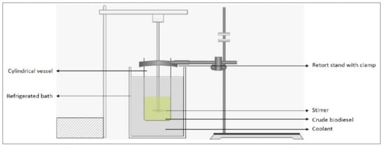 The experimental setup for the SAC process is referred to the study conducted by Ahmad and Samsuri [11] as shown in Figure 7. Firstly, the chiller was turned on to cool down the coolant temperature. The desired temperature was set before conducting the experiment. The range temperature for the whole experiment is between −4 °C and −12 °C. After that, about 500 mL of crude biodiesel with 1 wt.% of 2-MeTHF were fed into a cylindrical vessel (11 cm × 24 cm). The vessel was placed inside the chiller which was filled with coolant once the desired temperature was reached. Next, the stirrer was switched on and left until the expected cooling time.