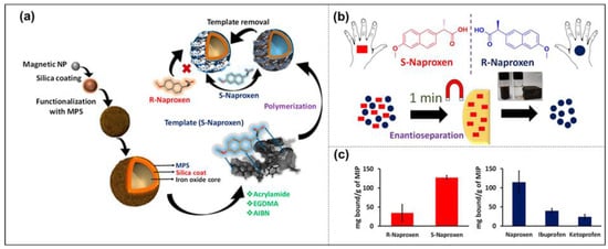 The overview of the synthesis of (S)-naproxen-imprinted nanoparticles (a); rapid magnetic separation of enantiomers (b); selective nature towards enantiomer, (R)-naproxen, and other similar structures, ibuprofen and ketoprofen (c) Reprinted with permission from Ref. [41]. Copyright 2019, ACS.