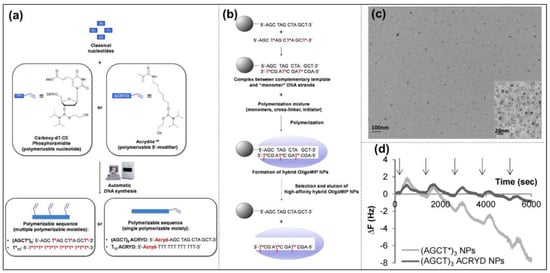 MIP−NPs were prepared using a solid-phase blot polymerization strategy using oligomer DNA sequences as template molecules. Schematic for the preparation of polymerizable oligonucleotide sequences used as recognition elements in the MIP−NPs composition (a); schematic representation of the solid-phase synthesis and selection of oligo MIP−NPs (b); TEM image of MIP−NPs (c); QCM graph of (AGCT)3 acrylic MIP-NPs and (AGCT*)3 MIP−NPs (d). Reprinted with permission from Ref. [59]. Copyright 2016, Royal soc of chemistry.