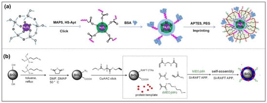 The earliest use of surface imprinting to prepare imprinted protein MIPs was reported by Glad et al., who reacted the glycoprotein transferrin with boronate silane in a solution to polymerize on the surface of porous silica [61]. The boronate group can reversibly react with sugars and glycoproteins through the ester group, and the pre-binding of boronate silane with transferrin makes the boronate group correctly arranged, so the imprinted site has specific binding to transferrin. In 1999, Shi et al. proposed the plate surface imprinting method, which firstly adsorbed proteins on mica with high atomic contents, then coated disaccharide molecules on proteins, and the two were bonded by a hydrogen bond. Then a thin layer of fluorescent polymer was polymerized on the surface of sugar molecules. Finally, the mica were removed and the protein molecules were dissolved. A polydisaccharide surface-imprinted polymer with protein-shaped holes was generated [62]. In recent years, efforts have been devoted to the preparation of MIPs with core/shell structures, which can be divided into two kinds by their different sequences of protein addition: prefixed and unfixed (Figure 4). Li et al. used boronate affinity to fix glycoprotein with controllable orientation first, and then the self-polymerization of 2-anilinoethanol was carried out to form a thin imprinting layer on the surface of the magnetic nanoparticles [63]. Moreover, the interaction between aptamer and BSA was also chosen to immobilize the BSA on the surface of nanoparticles for temple-prefixed surface imprinting (Figure 4a) [64]. Fu’s group developed a series of surface imprinting SiO2 nanoparticles with protein dissolved in the reaction solution [65]. For example, they developed a novel strategy for pegging surface-imprinted nanoparticles using surface-induced reversible addition–fragmentation chain transfer with lysozyme as a template (Figure 4b) [66]. Water precipitation polymerization (SI-RAFT APP) was used to synthesize the imprinted nanoparticles with a core/shell structure, then nonlinear PEG chains were grafted onto their surfaces, and finally the template was removed. The thickness of the imprinted nano-shells and the length of the grafted chains could be controlled by the polymerization time.