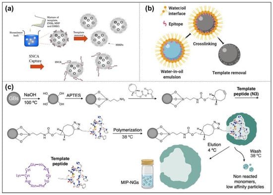 Methods of epitope imprinting. The protocols of epitope imprinting via precipitation polymerization (a) inverse emulsion polymerization (b); and solid-phase synthesis (c). Reprinted with permission from Refs. [45,70,71]. Copyright 2022, MDPI; 2020, Wiley; 2021, Wiley.