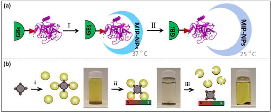 Currently, the solid-phase imprinted synthesis of MIP-NMs has been shown to be a state-of-the-art method for synthesizing receptors for a range of diagnostic and biomedical applications, usually by first immobilizing template molecules on supports (glass beads) before adding reactive monomers to induce polymerization [73]. After adding an initiator to initiate polymerization, the unreacted monomers or low-affinity polymers are washed away. The obtained MIP-NMs are attached to the solid support, and then the MIP-NMs are washed off using a suitable condition [74,75]. It can be carried out by persulfate-initiated polymerization in an aqueous solution or UV-initiated in an organic solvent. To be effectively used in the medical field, the polymerization should be carried out in an aqueous solution as much as possible. Studies have shown that the process is easy to automate and can yield well-performing MIP-NMs in a relatively short period. Due to its affinity purification step, the solid-phase synthesis of MIP-NMs has a high affinity and strong specificity, and the binding sites appear uniformly distributed. Since the template molecule is immobilized on the solid support and can be reused, the template molecule is no longer required when preparing MIP-NMs to pass through the polymerized monomer, which reduces the number of template molecules used, and at the same time, the tedious template elution step is no longer required. Based on the solid-phase imprinting method, Xu et al. used functionalized glass beads (GB) with metal chelates for the immobilization of trypsin [76]. The thermos-responsive functional monomer N-isopropyl acrylamide (NIPAAm), the anchor monomer p-aminobenzamidine (PAB) of the affinity ligand, and the cross-linker EbAm were introduced at 37 °C under the conditions of the initiator system. This solution polymerized and eluted MIP-NPs at 25 °C. The results showed that the MIP-NPs synthesized by solid-phase blotting could be stored stably for up to 6 months in a buffer at 4 °C and had a higher binding affinity and higher selectivity for the target molecule, trypsin (Figure 6a).