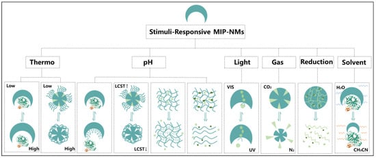 Most of the MIPs prepared by using the traditional methods described above are rigid structures and can only identify target molecules simply and mechanically. Although molecular imprinting technology has developed rapidly in recent years, compared with the interactions of natural antigens–antibodies and ligands–receptors in vivo, it still lacks flexibility and variability, and cannot actively respond to external stimuli and make corresponding responses. To this end, intelligent stimuli-responsive MIPs came into being.