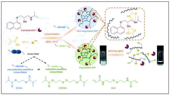 Such reduction responsiveness systems mainly use two different strategies: the insertion of disulfide bonds in the polymer backbone or the use of reduction-sensitive cross-linking molecules [112], which can be incorporated into the core or shell of appropriate nanocarriers. It is worth mentioning that Zhao et al. published an article on reduction-responsive MIP-NGs [113]. They used the β-blocker S-propranolol for cardiac disease as a template molecule, and BIS(2-methacryloyloxyethyl) disulfide (DSDMA) or N, N-bis(acryloyl) cystamine (BAC) as the disulfide-containing cross-linker to synthesize reduction-responsive MIP-NGs, which exhibited better binding properties for S-propranolol than that constructed with conventional cross-linker EDMA (Figure 8). Moreover, in the presence of intracellular concentrations of GSH, the rate of S-propranolol release was higher, suggesting that these materials could potentially be used as intracellular controlled drug delivery systems.