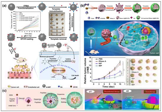In recent decades, breakthroughs have been made in the preparation of advanced functional nanomaterials, and researchers have devoted themselves to the study of molecularly imprinted polymer nanomaterials (MIP-NMs) (diameters less than 200 nm) with a uniform particle size and controllable morphology. Compared with traditional MIPs, MIP nanoparticles (MIP-NPs) have a good dispersion ability, a high surface-area-to-volume ratio, and easy elution of template molecules, as well as exhibit a high binding capacity, high selectivity, high affinity, and good water compatibility [18]. Therefore, the application fields of MIP-NPs have also expanded from separation and detection to biomedicine (bioimaging [19,20,21,22], cancer diagnosis [23,24,25], targeted drug delivery [26,27], controlled drug release [28,29,30], etc.). MIP-NPs are expected to become an attractive research tool for a wide range of studies in the biomedical field. Molecularly imprinted nanogels (MIP-NGs) are also a promising innovative material in the biomedical field. As a dispersion based on swollen hydrogel nanoparticle networks composed of hydrophilic or amphiphilic polymer chains, MIP-NGs have relatively high uniformity, adjustable sizes, low toxicity, stability in serums, and good drug encapsulation ability, etc.; hence they are referred to as next-generation drug delivery systems [31]. Therefore, MIP-NGs show great potential in disease diagnosis, cancer drug delivery, and imaging.