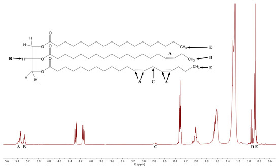Figure 1 is an idealized triacylglycerol. The five labels, A through E, on the structure indicate the protons that give rise to the resonances obtained in the spectrum.