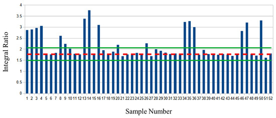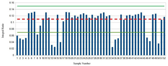 Figure 4 shows the ω-3 methyl to remaining methyl proton ratio (D:E) of the market survey samples. The average ratio of the baseline samples is shown with a red dashed line. The green lines indicate the mean plus or minus two S.D. Again, 14 different samples show significant deviations from the average values, this time to lower integral ratios.
