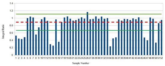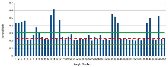 Figure 2, the dashed red line is the average value of the unsaturated bonds to glycerol C2 proton ratio (A:B) of the baseline samples. The green lines represent the ± two standard deviations (S.D.) of the baseline sample ratio average. A number of samples (n = 17) appear to be outliers (deviation greater than two S.D.) based on the ratiometric analysis.