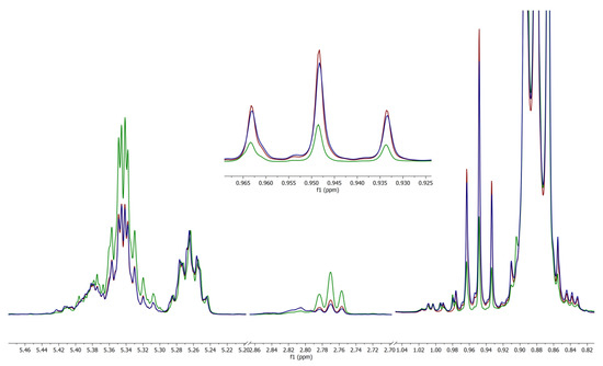 2]. This allows for much easier quantification of ω-3 fatty acids with NMR and speeds the determination of a sample’s lipid profile. Additionally, this structural information is invaluable when comparing levels of polyunsaturated fatty acids, total numbers of unsaturated bonds, and ω-3 fatty acid levels present in a sample. While not an exhaustive analysis of the sample’s composition, it is often sufficient to determine the authenticity of said sample.
