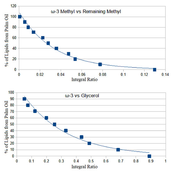 Figure 7). The functions for each curve followed an exponential regression. The equation for ω-3 vs. remaining methyl peak was found to be F(x) = 108.9584 × 10