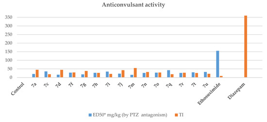 The study of the anticonvulsant activity of hybrids 7a–u was assessed by evaluating the antagonism to pentylenetetrazole (PTZ), thiosemicarbazide convulsive seizures, and maximal electroshock-induced seizures (MES) [29,30,31,32,33]. The PTZ-induced test is considered an experimental model for the clonic component of epilepsy seizures and the prognostic anxiolytic activity of the compounds. PTZ is a common convulsive agent used in animal models to investigate the mechanisms of seizures. The model of thiosemicarbazide (TSC) seizures (affecting the exchange of GABA) causes clonic seizures similar to pentylenetetrazole ones. The MES test is used as an animal model for the generalization of tonic seizures in epilepsy [34,35]. The neurotoxicity and side effects of the compounds (movement coordination disorder, myorelaxation, and ataxia) were also studied on mice with the “rotating rod”[29] test.