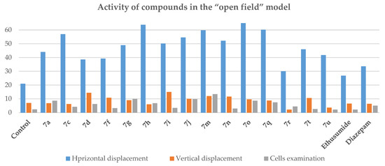 Graphical representation of activity of compounds 7a, c, d, f–j, m–o, q, r, t, u, ethosuximide, and diazepam in the “open field” model.