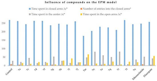 Graphical representation of the influence of compounds 7a, c, d, f–j, m–o, q, r, t, u, and compared drugs on the EPM model (5 min of research). * indicates p = 0.05 at the probability level.