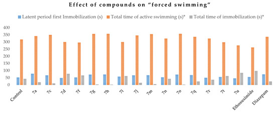 The forced swimming test (FST) is used to monitor depressive-like behavior and is based on the assumption that immobility reflects a measure of behavioral despair. On the “forced swimming” model, some of the selected compounds (7a, c, g, h, j, m, o, and q) increase the active swimming time and the latent period of the first immobilization (Table 7, Figure 5). In control mice, the first immobilization occurs after 52 s. This indicates that the studied compounds at a dose of 50 mg/kg exhibit some antidepressant effect. The data regarding ethosuximide at a dose of 200 mg/kg are comparable with the control data. The reference drug diazepam at a dose of 2 mg/kg acts similarly to the noted compounds, increasing the latent time of the first immobilization. At the same time, diazepam significantly reduces the total immobilization time, while the compounds 7a, c, g, h, j, m, o, q, and ethosuximide increase this time.