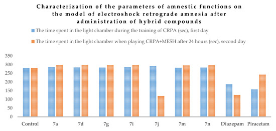 Graphical representation of the characterization of the parameters of amnestic functions on the model of electroshock retrograde amnesia after administration of hybrid compounds 7a, d, g, i, j, m, and n (study for 5 min).