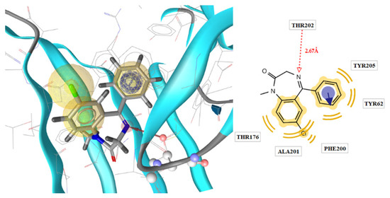 Docking results presented in Table 9 revealed that compound 7j bound tightly in the active site of the GABAA receptor with a value of free binding energy of −10.36 kcal/mol, forming three hydrogen bonds between the nitrogen atoms and residues Tyr97 (N···H, 3.31Å), Thr202 (N···H, 3.13Å) and Tyr205 (N···H, 2.95Å), while diazepam forms only one hydrogen bond with Thr202 (N···H, 2.67Å, Figure 8 and Figure 9). Furthermore, the furan moiety of the compound showed hydrophobic interactions with the residues Ala201 and Phe200, further stabilizing the complex ligand-enzyme.