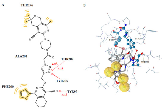 Docked pose of compound 7j and the GABAA receptor complex; (A) 2D diagram, (B) 3D representation. red lines show the hydrogen bonds and yellow spheres represent hydrophobic interactions.