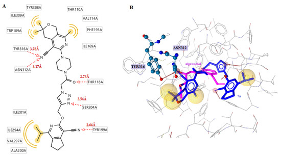 All the tested compounds were docked into the orthosteric binding site of the 5-HT1A receptor (Table 11), and the best docking score was found for compound 7a (−11.23 kcal/mol), which formed five hydrogen bonds with the residues Tyr118, Tyr199, Ser204, Asn312, and Tyr316. Additionally, hydrophobic interactions were observed between methyl substituents of the compound and residues Trp109, Ile309, Tyr308, Phe193, Val114, Tyr110, Ile201, Val297, and Ala200 (Figure 13A). It is worth noting that alprenolol forms hydrogen bonds with the same Tyr316 and Asn312 residues as compound 7a does. Moreover, this compound is oriented in the same cavity of the enzyme as alprenolol (Figure 13B). This may justify the high activity of compound 7a. Finally, the docking studies revealed that this compound can probably be a dual target molecule since it seems to be a good inhibitor of the SERT transporter and a good 5-HT1A receptor binder.